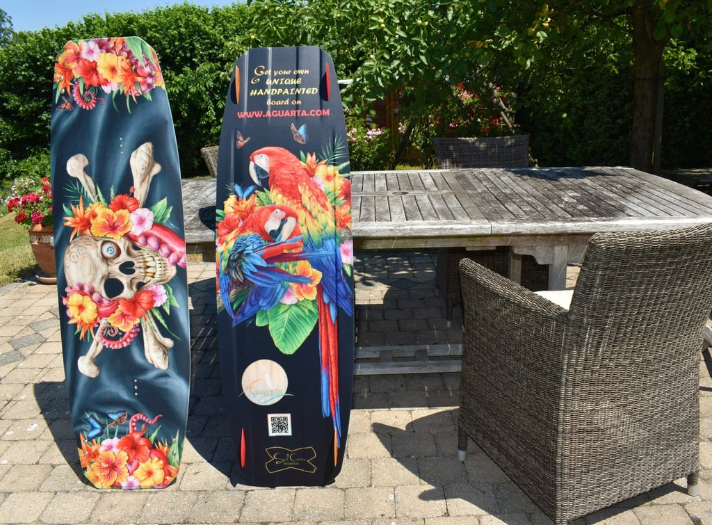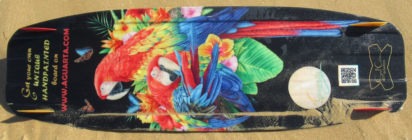 As can be seen on the pictures, the artworks really make the custom board pop out on the beach among the bulk of generic board designs, especially in the sunshine. This result is of course due to the 100% originally designed and handpainted work, in contrast with the impersonal photoshop-processed images you'll find on any big brand's boards. Worth noting though is that, in the case of Saul's boards, contrast-rich designs offer better results as the wood can be seen through the lighter parts. Contact us to know which board manufacturers offer the best results for more nuanced prints.